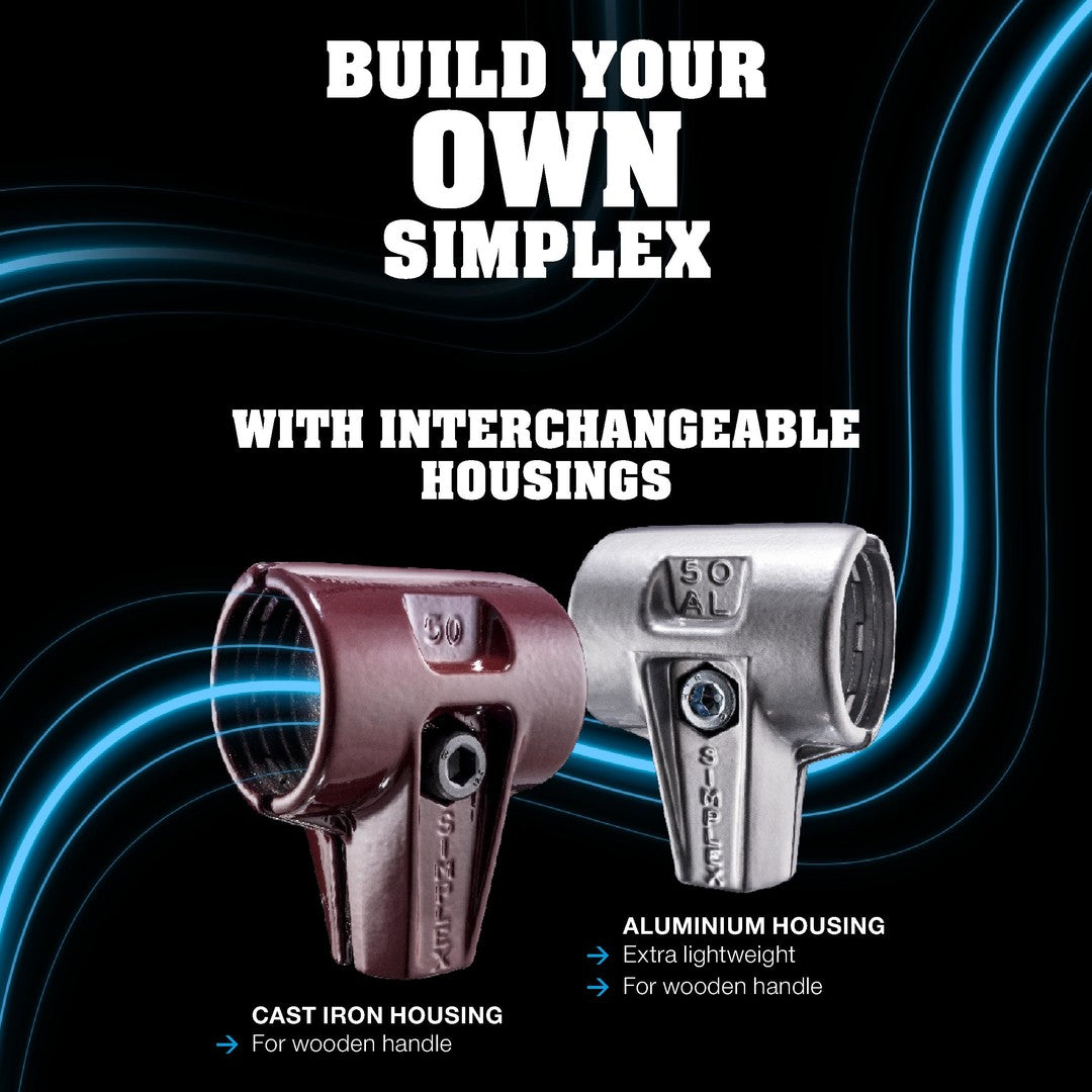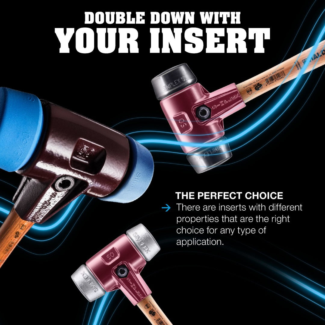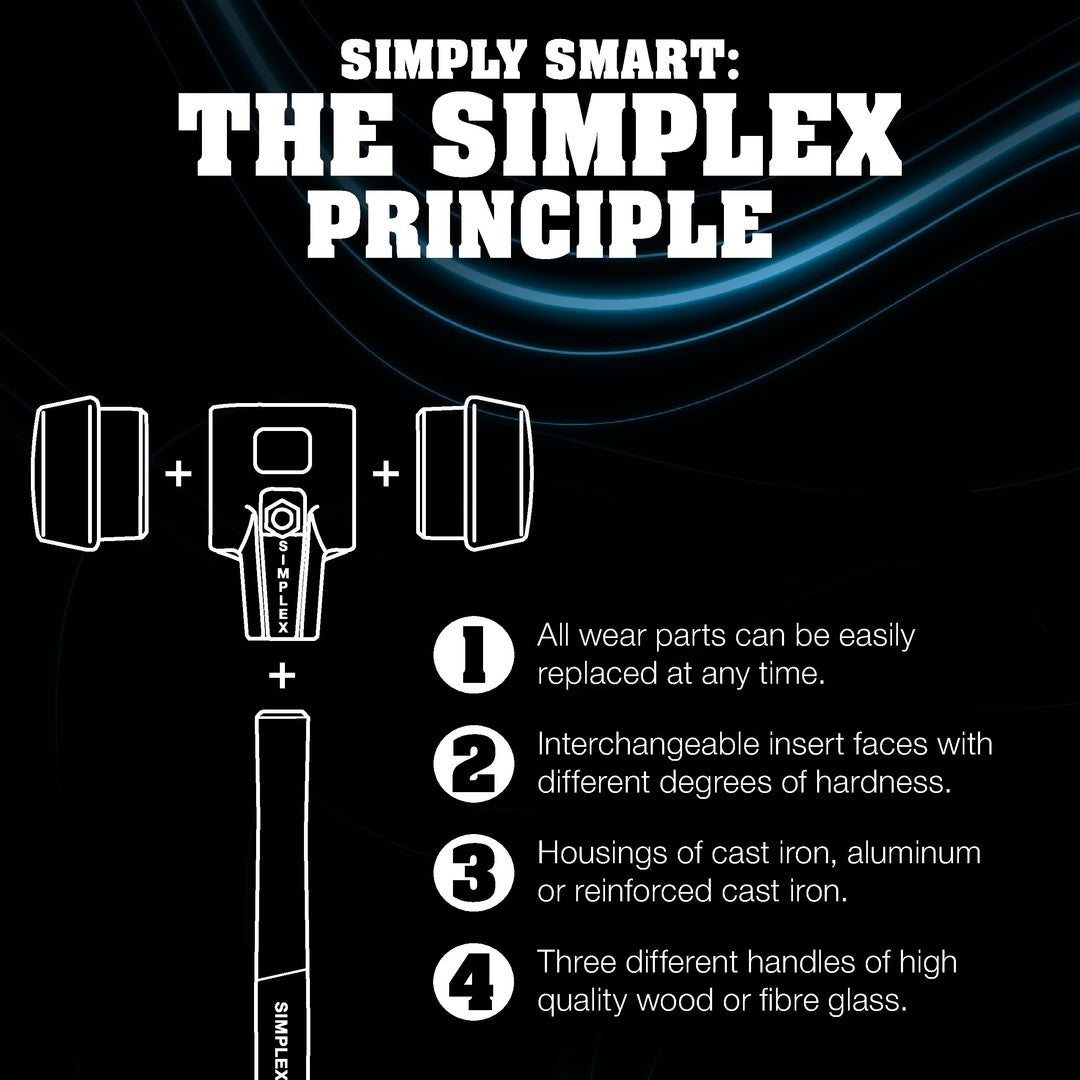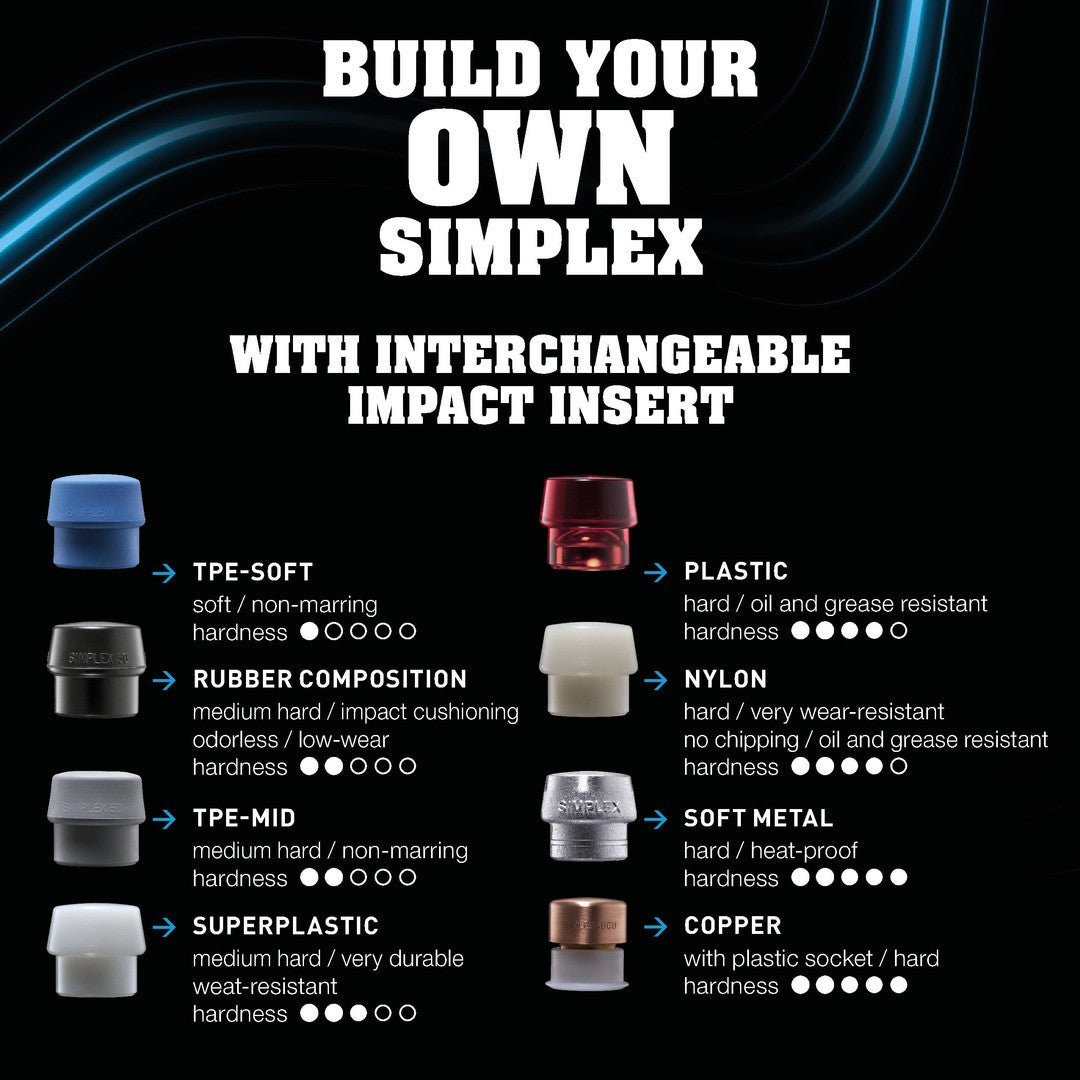 - SIMPLEX soft-face mallet with rubber composition inserts (black, medium hard, impact cushioning, odorless, low-wear) on both sides.