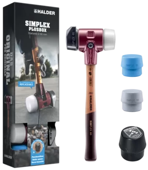 The Simplex soft-face mallet 2.36"/60mm (Art. 3027.260) with the insert combination of rubber composition / Superplastic is an absolute top seller in Halder's product selection. Boasting an ingenious shape, the rubber insert with "stand-up" allows the hammer to stand securely on its head and reduces the need to bend over, making it possible to work in a much more ergonomic and back-friendly manner. Ultra low-wear, impact cushioning and odorless, the proven rubber blend offers a much longer service life than a conventional rubber hammer. The superplastic insert allows for a more powerful impact force than the rubber insert. All parts can be replaced, which makes it highly efficient and sustainable.